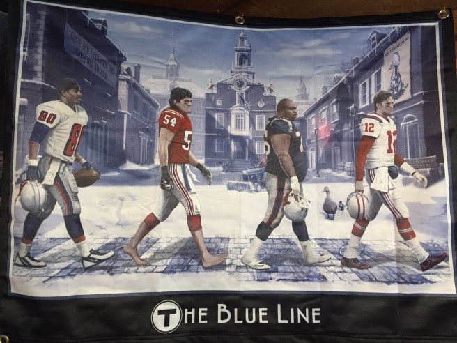 The room was dusty blue glow, shiny black floor, unnatural quiet – department of mysteries all the way. On each wall stood tapestries. Huge. Horrifying. Beautiful and yet terrible to behold. And they looked upon us. Standing proud at ship’s head like Washington on the Delaware, or marching across Abbey Road to lay claim upon the worlds of man. The players of the 2019 New England Patriots.