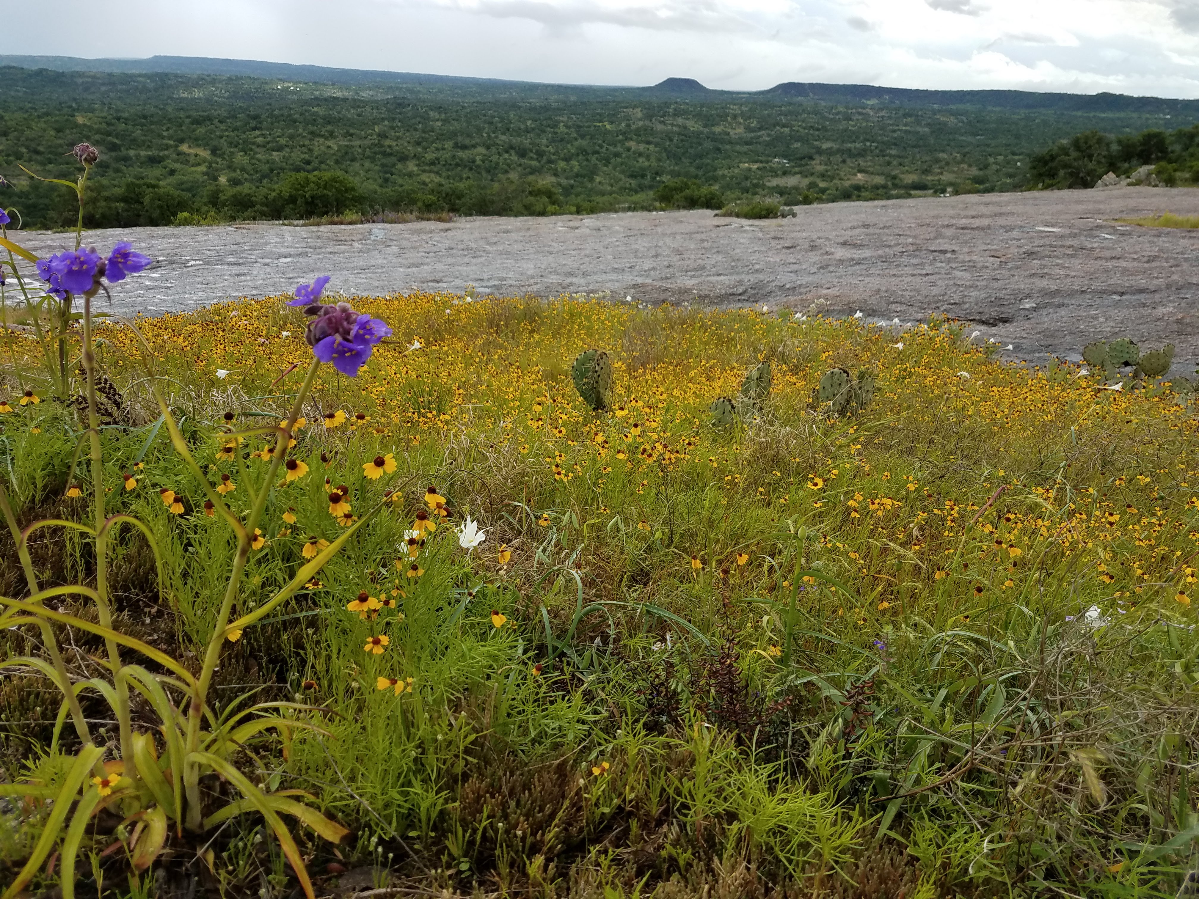 We hiked up the rock after breakfast, ignoring caution signs about slippery granite in rain. There aren’t really paths up or down the dome, so we chose a pretty fun scrambly way up. On the backside we found a wild flower field and a terrific view of the hill country. I think its always funny to visit things I knew as a small person, and realize how much they’ve apparently shrunk. I visited my elementary school recently and found that the playscape, a full size coloseum to shrimpy Lukas, was now smaller than the cat tower my stepmom bought a few years ago. E Rock is apparently an exception though. The view from the top is epic.