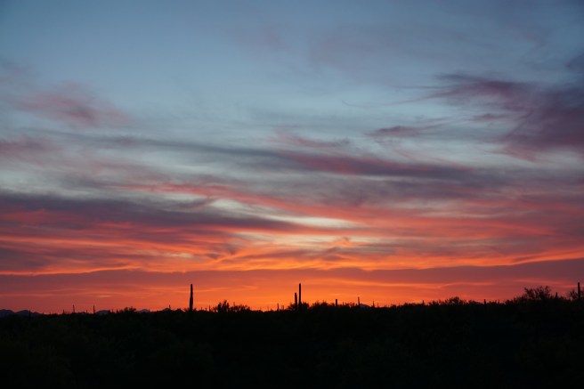 Salvation comes in endings. The day died. The sunset while we cooked pasta in Saguaro National Forest. Saguaros are your quintessential clipart cacti, so you think they’d be prolific, but this national park seems to have a monopoly. We did not see them till we entered the park and we’ve seen few when we left. They threw their arms in the air, ranging from one to seven, and shrugged off with us. The sunset was purple and the desert was pink and the cacti were blue and we painted away the day.